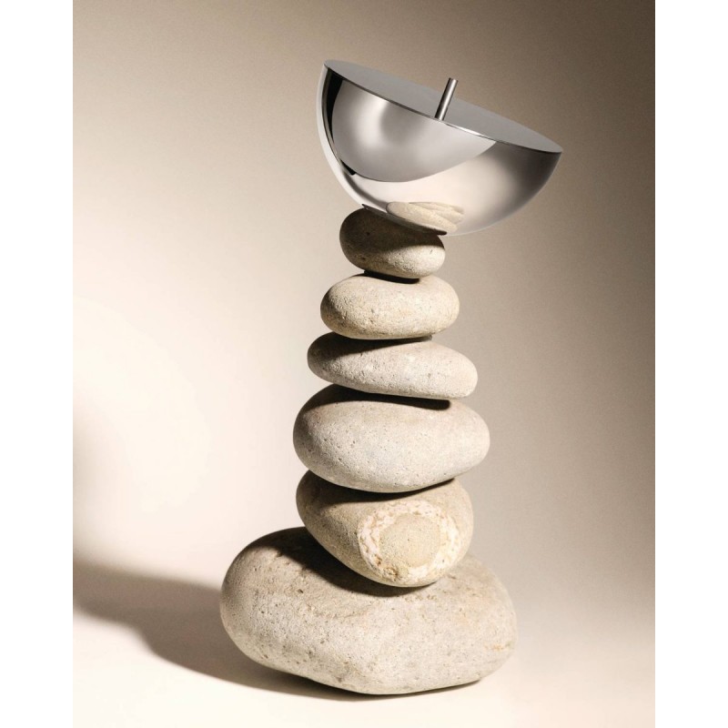 Contenitore in acciaio lucido, d. cm. 20, h. cm. 11, con candela profumata ( 6 varianti diferenti tra marble, basalt, amber, amethyst, clay, flint), ottima novità della rinomata azienda Alessi firmato dal famoso design Michael Anastassiades.