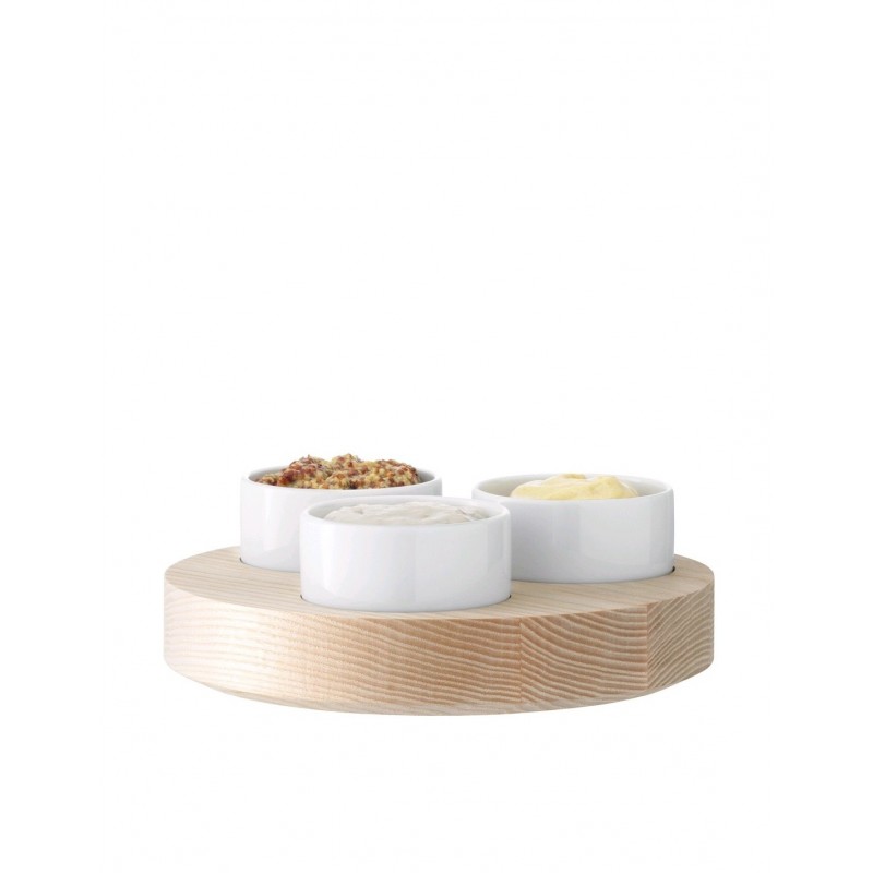 Set di piccolo tagliere in legno con tre ciotoline in porcellana bianca, simpatica quanto originale esecuzione artigianale inglese.