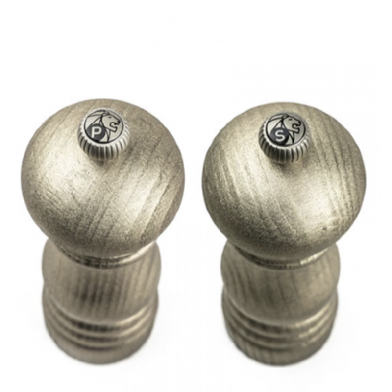 Set di macina sale e pepe in legno, h. cm. 18, finitura oro, ottima idea regalo della rinoma azienda francese Peugeot.