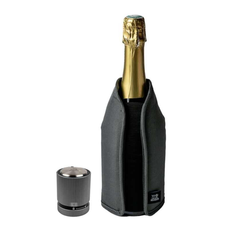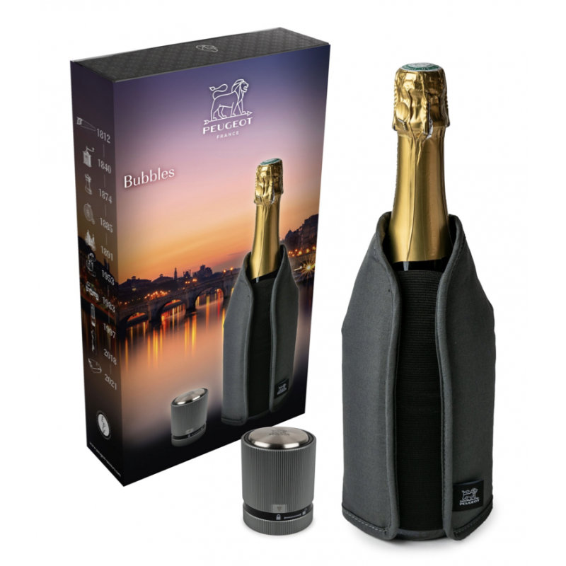 Glacette in tessuto con gel termico, in confezione regalo compresa di tappo per champagne in acciaio, ottima idea regalo della rinomata azienda francese Peugeot.