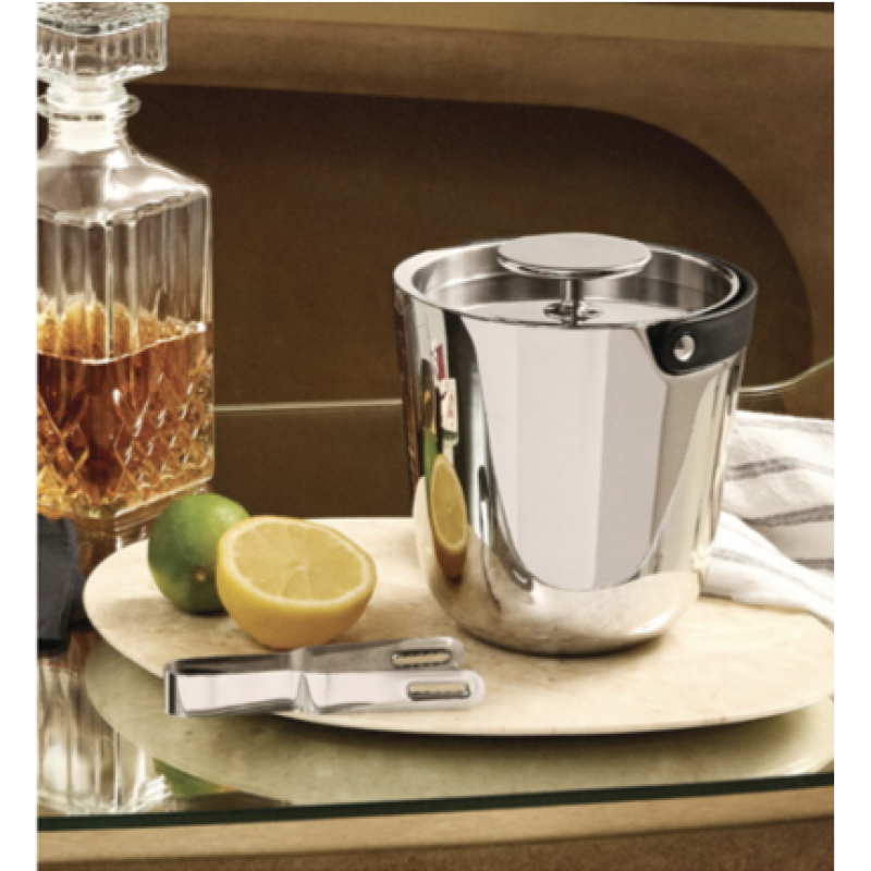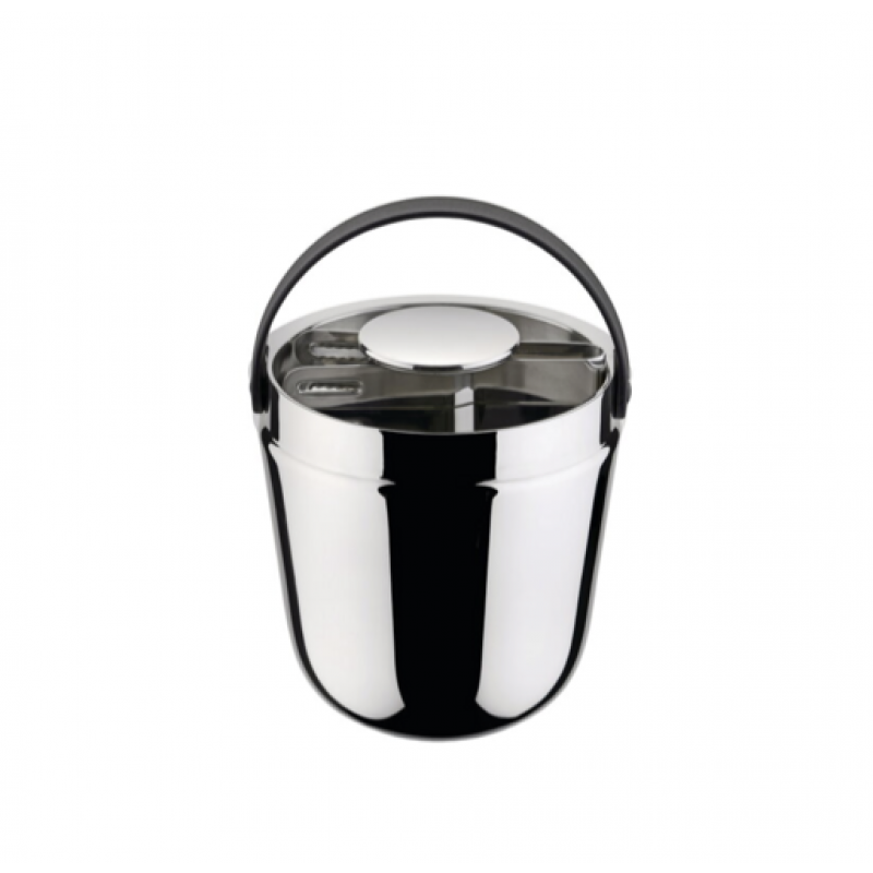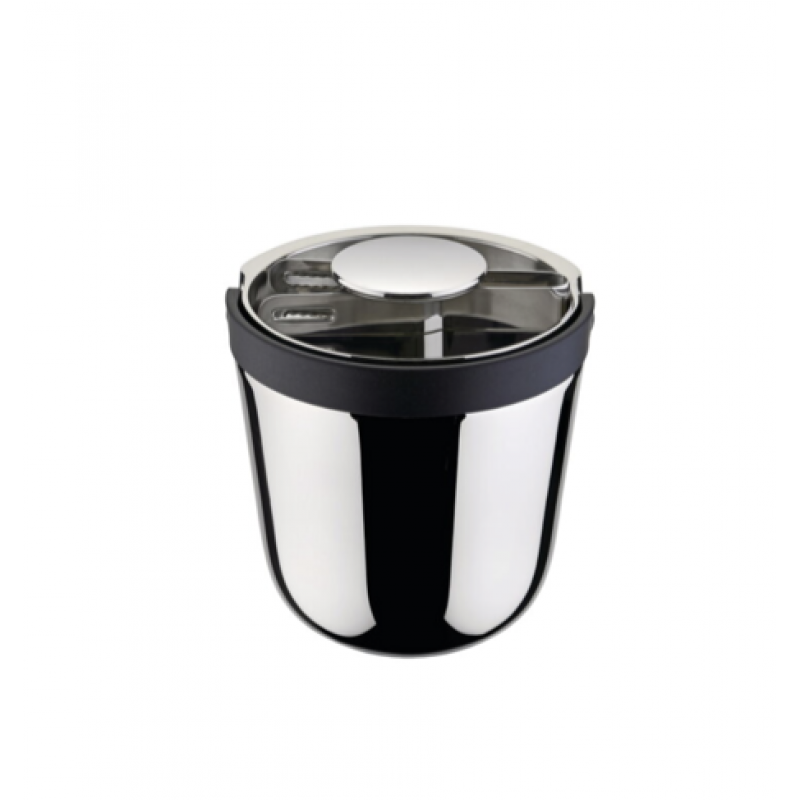 Secchiello ghiaccio in acciaio con parete termica, coperchio, manico richiudibile, dotato di pinza, h. cm 16, d cm 15, capacità lt 1,2, design Giulio Iaccheti per Alessi.