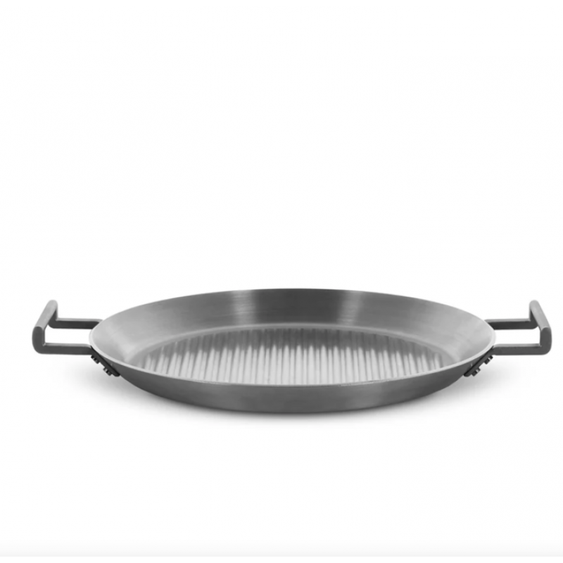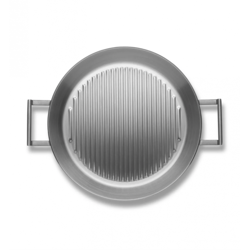 Bistecchiera in acciaio satinato ed alluminio d. cm 36, h cm 4, adatata a qualsiasi piano cottura, buona esecuzione della rinomata azienda italiana Alessi.