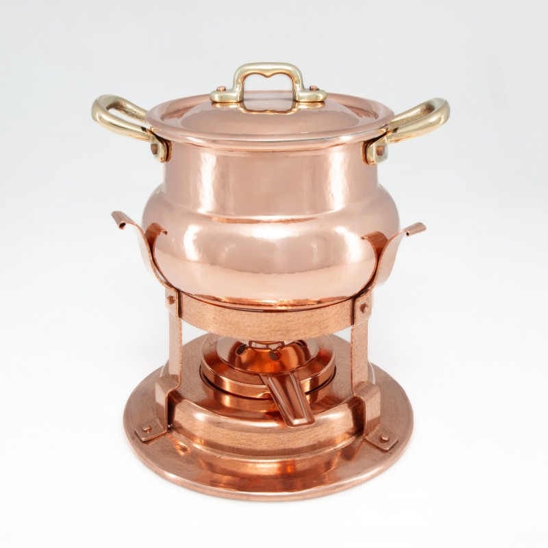 Casseruola in rame battuto a mano, con stagnatura naturale interna, d. interno cm. 14, d. ai manici cm. 21, h. al coperchio cm. 14, con supporto rame e legno, h. complessiva supporto e casseruola cm. 25, eccellente esecuzione artigianale italiana.