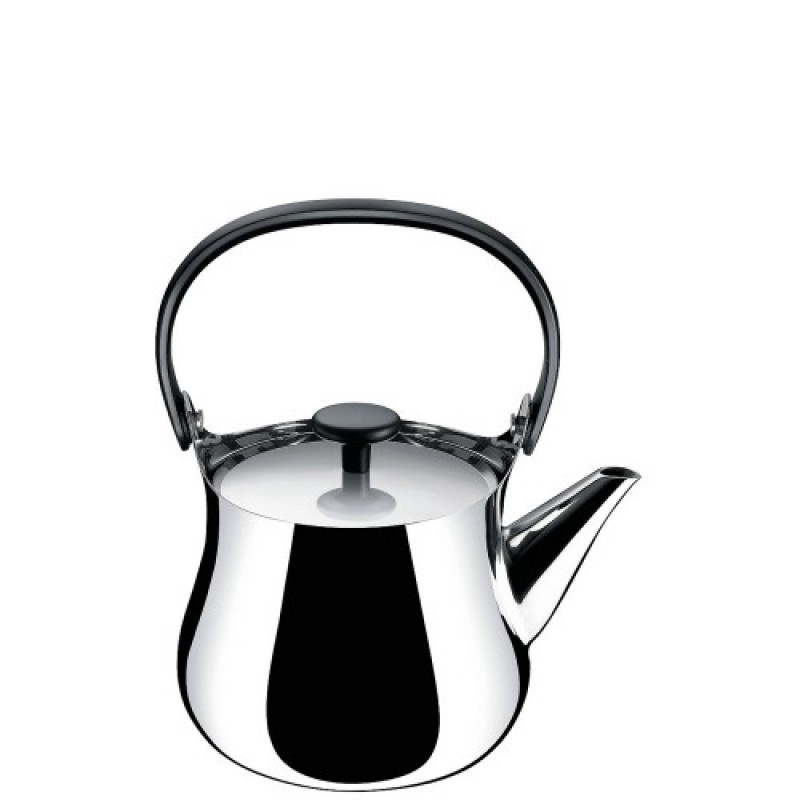 Teiera in acciaio da induzione modello Cha in confezione regalo con coppia di tazze in porcellana decorata "Itsumo - Yunoki ware", graziosa idea regalo della rinomata azienda italiana Alessi.